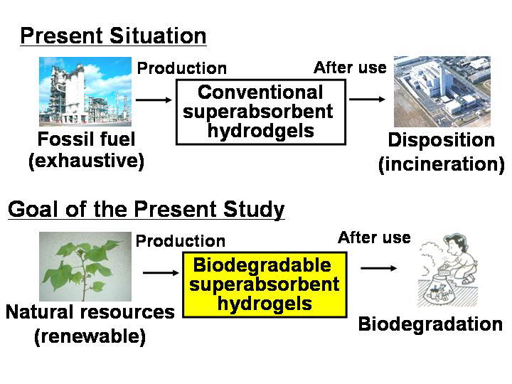 biodegradability. So we have been studying the development of superabsorbent hydrogels based on polysaccharides such as cotton cellulose, chitin, starch, and so on. Various kinds of novel biodegradable superabsorbent hydrogels have been successfully obtained from these polysaccharides.