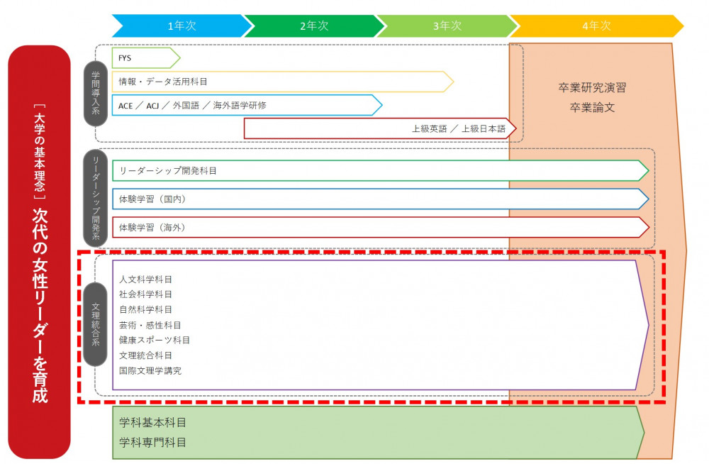 「次代の女性リーダー育成」を具現化するため、リーダーシップ開発系科目群として「リーダーシップ開発科目」と「体験学習科目」を設けます。