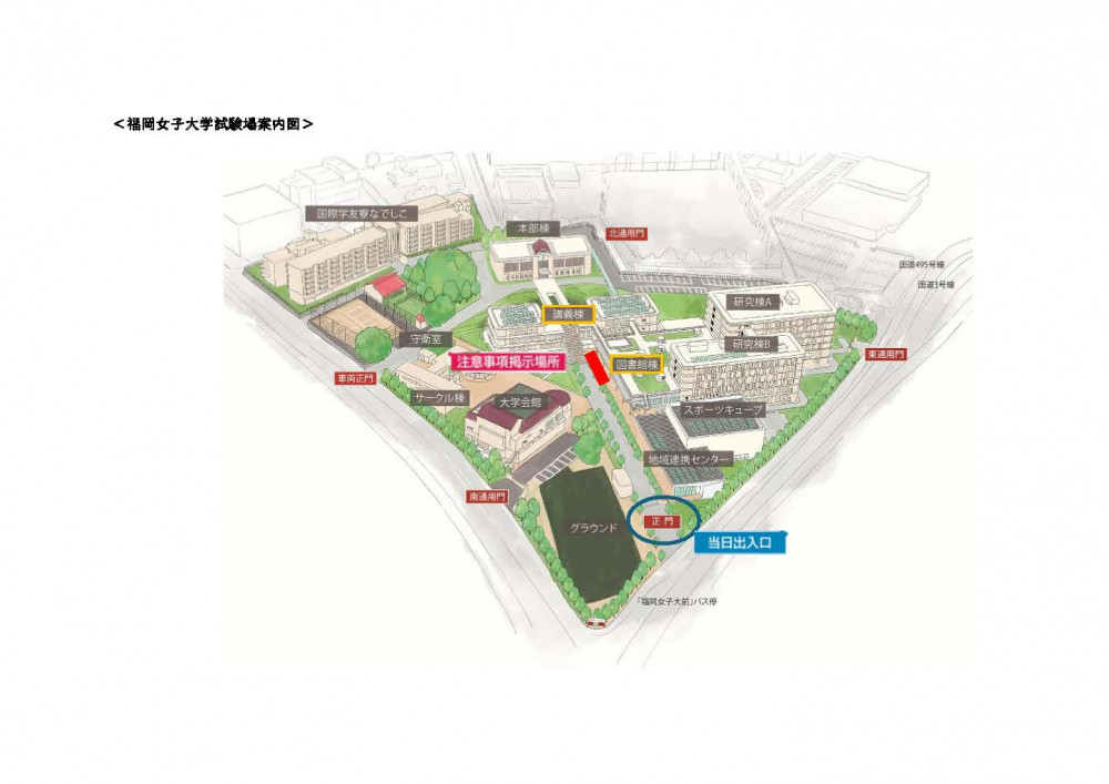 ・ 試験前日午後より図書館棟入口付近に受験上の注意事項等を掲示しますので、しっかりとご確認ください。