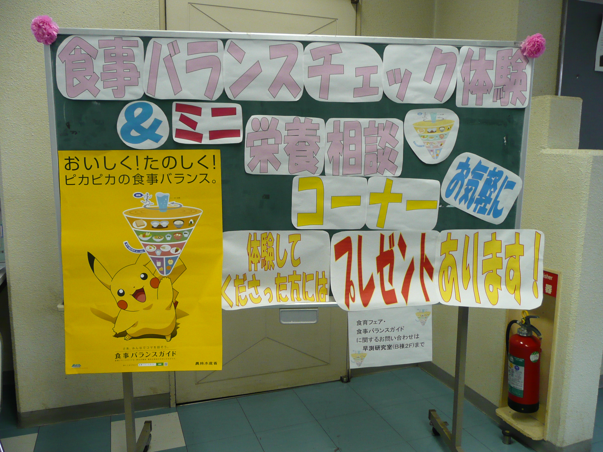 昨年に引き続き、今年も福岡女子大学の食堂において食育フェアを行いました!今年は、昨年と同様、メニューの栄養コマ表示や食事バランスガイドの掲示や食事バランスチェック体験とミニ栄養相談を行いました。![]()