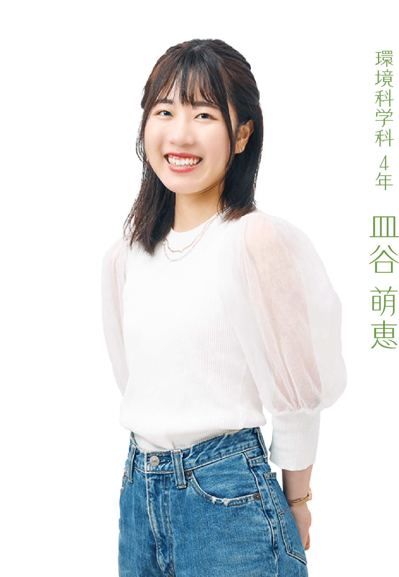 私は高校生の頃から管理栄養士を目指しており、進学先を考える際に福岡女子大学と出会いました。ホームページやパンフレットで詳細を調べていくうちに本学の様々な面に惹かれたのですが、その魅力の一つとして、女性リーダーの育成に力を入れているという点が挙げられます。女性が高い志と柔軟な発想を持ち、リーダーシップを発揮し、地域社会や世界を舞台に活躍できる社会を目指して、本学での多彩な活動に参加することで自分に自信を持ち、将来管理栄養士として人々を支えていけるような女性になりたいと思っています。